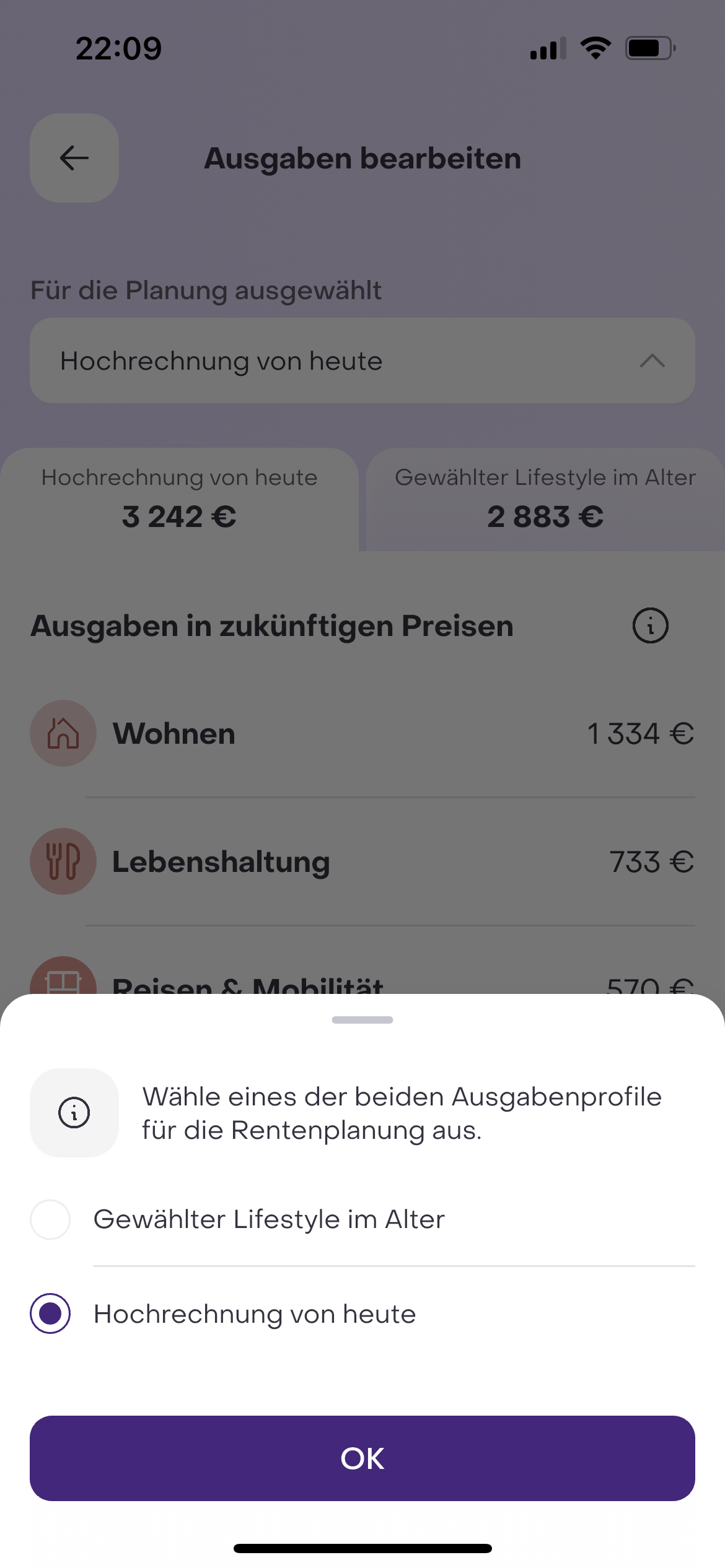 Im Tab Ausgaben werden Deine prognostizierten monatlichen Ausgaben, unterteilt in Wohnen, Lebenshaltung, Reisen & Mobilität, Versicherungen, Freizeit und sonstiges aufgezeigt. Du kannst unter Bearbeiten, zwischen dem aus heutigen Daten hochgerechneten Lifestyle oder dem unter Feature Hub gewählten Lifestyle im Alter wählen, um verschieden Lifestyle-Entscheidungen zu simulieren.