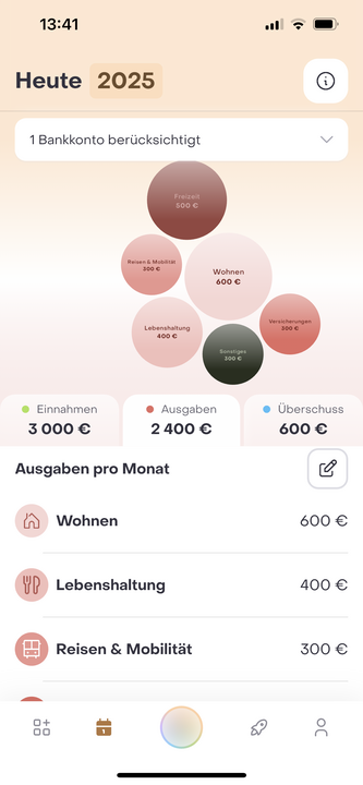 Im Tab Ausgaben werden Deine monatlichen Ausgaben, unterteilt in Wohnen, Lebenshaltung, Reisen & Mobilität, Versicherungen, Freizeit und sonstiges aufgezeigt. Diese werden aus Deinem Konto automatisch eingelesen, können aber auch manuell angepasst werden.