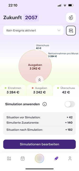Unter Simulationen kannst Du verschiedene von Dir getätigte Finanzentscheidungen simulieren. So kannst Du in etwa monatliche Wertpapiersparpläne oder den Kauf einer Immobilie simulieren. Unter Dashboard Zukunft >> Überschuss >> Simulation anwenden, kannst Du die Effekte der ausgewählten Simulationen aus- und anschalten. Dein simuliertes Produkt findest Du anschließend sowohl in Deinem Produkt-Dashboard, sowie Deinem Dashboard Zukunft. Alle Produktsimulationen sind realen Produkten nachempfunden und dementsprechend modelliert.