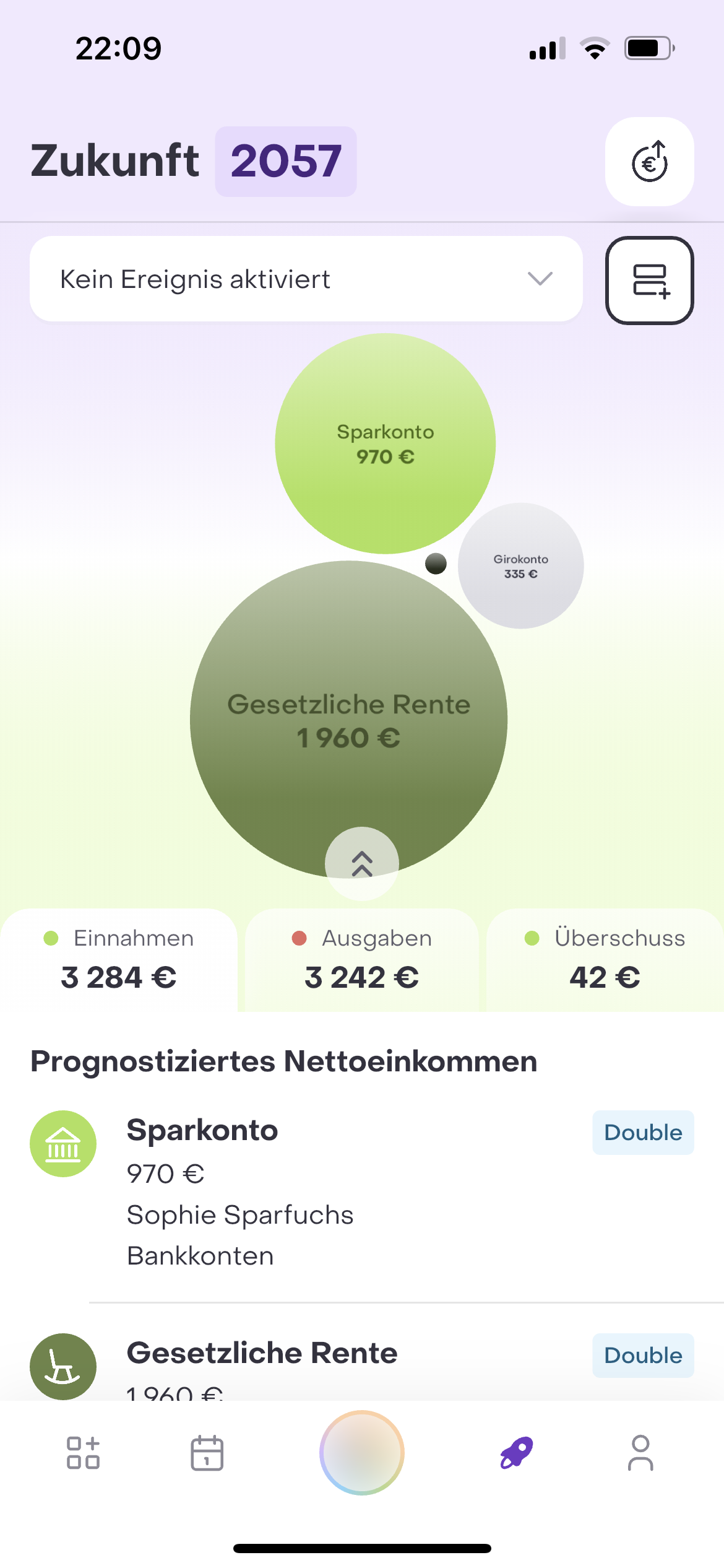 Im Tab Einnahmen werden Deine prognostizierten monatlichen Netto-Einnahmen, unterteilt in Deine Finanz- und Vorsorgeprodukte aufgezeigt. Hierbei werden auch Deine aktivierten Ereignisse und Simulationen berücksichtigt. Wenn Du runterscrollst, wird auch Dein entsprechendes Brutto-Einkommen angezeigt.