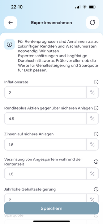 Für Rentenprognosen sind Annahmen u.a., zu zukünftigen Renditen und Wachstumsraten notwendig. Diese kannst Du im Profil unter „Expertenannahmen“ ändern. Wir nutzen Expertenschätzungen und langfristige Durchschnittswerte als Standardwerte, die Du allerdings für Deine individuelle Situation anpassen kannst. Prüfe vor allem, ob die Werte für Gehaltssteigerung und Sparquote für Dich passen. Inflationsrate: Dies ist die angenommene Geldentwertung pro Jahr bis zum Renteneintritt. Mit dieser Rate werden z.B. heutige Lifestyle-Ausgaben in zukünftige übersetzt. Der Standardwert hierfür ist 2%. Renditeplus Aktien gegenüber sicheren Anlagen: Dieser Wert gibt das erwartete Renditeplus von Aktien gegenüber Deinen sicheren Anlagen an. Wenn Du also zukünftig sichere Anlagen in Aktien umschichtest, verdienst Du im Mittel so viel Rendite mehr pro Jahr. Der Standardwert hierfür ist 4.5%. Zinsen auf sichere Anlagen: Dies ist der zukünftige Zins (vor Steuern) auf Deine sicheren Anlagen wie Sparbücher oder Anleihen. Der Standardwert hierfür ist 1.5%. Verzinsung von Angespartem während der Rentenzeit: Dies ist die Nachsteuer-Rendite, mit der alle bis zum Renteneintritt angesparten Kapitalbeträge und Immobilienwerte in eine monatliche Rente bis zum Lebensende gemäß Sterbetabelle umgewandelt werden. Der Standardwert hierfür ist 1.5%. Jährliche Gehaltsteigerung: Dies ist die erwartete jährliche Steigerung Deines Nettogehalts bis zum Renteneintritt. Der Standardwert hierfür ist 2% und entspricht somit der Inflationsrate. Sparquote: Dies ist der Anteil Deines Einkommens, der gespart wird, also in Sparpläne, Tilgungen und Versicherungsbeiträge fließt oder auf dem Bankkonto bleibt. Schau im Dashboard „Heute“ nach, was Deine heutige Sparquote ist, und passe sie ggf. hier für die Zukunft an, wenn Du denkst, dass Deine Sparquote auch in Zukunft ähnlich bleiben wird. Das ist tendenziell eher der Fall, wenn Sich in der Zukunft keine großen Änderungen in Deinem Einkommen und/oder Deinen Ausgaben ergeben wird. Der Standardwert hierfür ist 20%. Einkommenssteuertabelle mit Inflation anpassen: Höhere Einkommen werden stärker besteuert. Hier kann eine kalte Progression, also höhere Steuern allein aufgrund von allgemeinen Einkommenssteigerungen, neutralisiert werden. Standardmäßig ist diese Option ausgewählt.