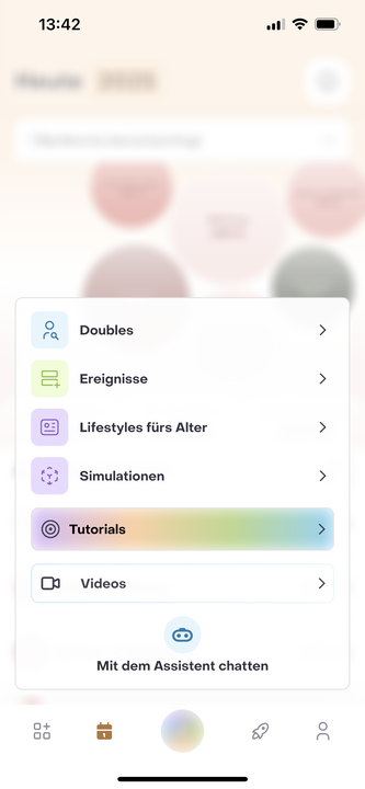 Im Feature Hub gibt es die Funktionen Profilvorlagen, Ereignisse, Lifestyles fürs Alter, und Simulationen, die es Dir erlauben verschiedenen Einflussfaktoren zu simulieren, um bestmöglich auf alle Unwägbarkeiten vorbereitet zu sein. Zusätzlich stehen Dir die Funktionen Tutorials, Videos und mit dem Assistent chatten zur Verfügung, die Dir bei der Nutzung und dem Erkunden der App zur Seite stehen.