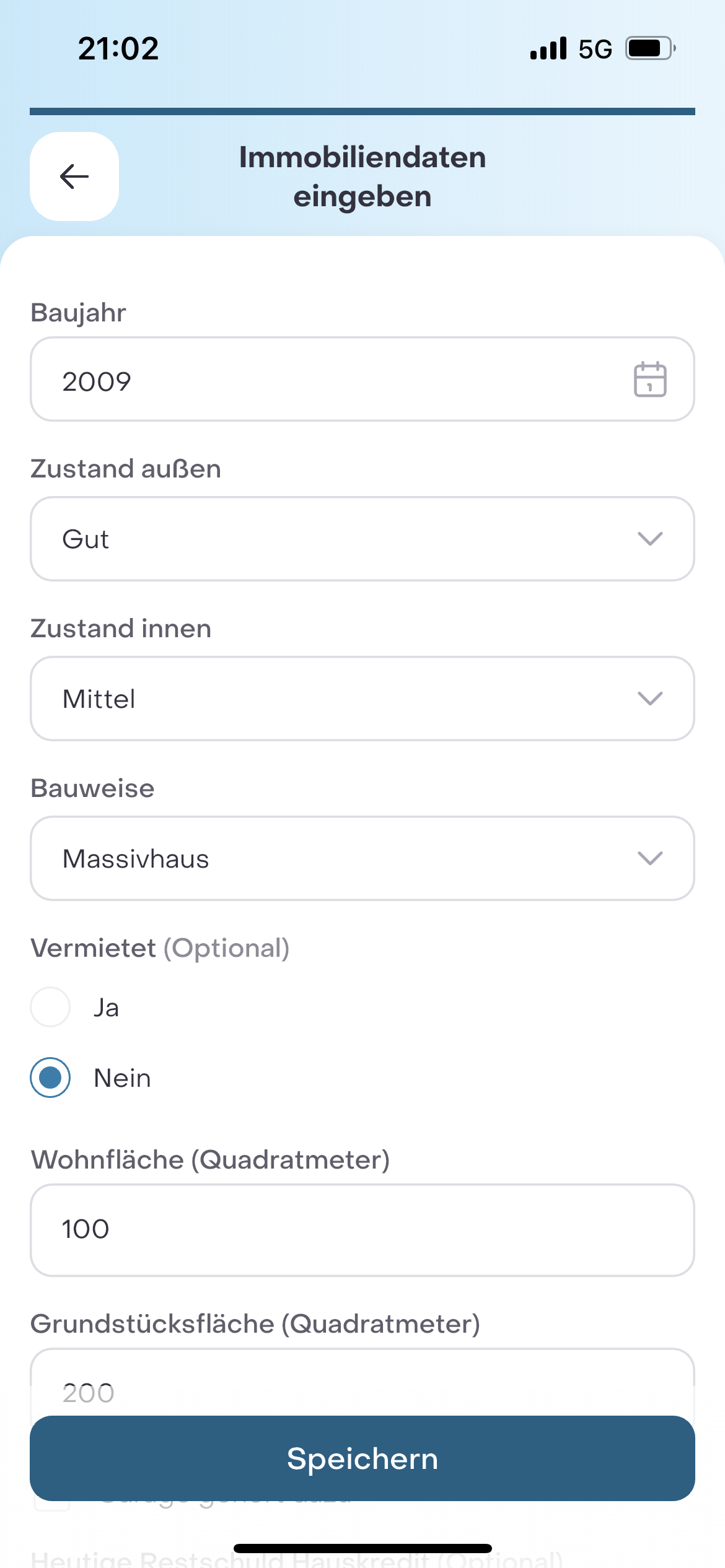 Um eine Immobilie hinzuzufügen kannst Du den Wert der Immobilien von Seasn auf Basis der Adresse, Baujahr, Zustand, Bauweise, Wohnfläche und heutigen Restschuld schätzen lassen. Die Schätzung Deiner Immobilie basiert auf den Preisdaten von vdp Research. Alternativ kannst Du auch Deine eigene Schätzung eingeben. Seasn prognostiziert die monatlichen Renteneinahmen auf Basis des heutigen Wertes, der bis zum Renteneintritt mit einer für Immobilien zu erwartende Rendite hochgerechnet und dann in eine sichere, lebenslange (gemäß Sterbetafel), monatliche Rente umgerechnet wird.
