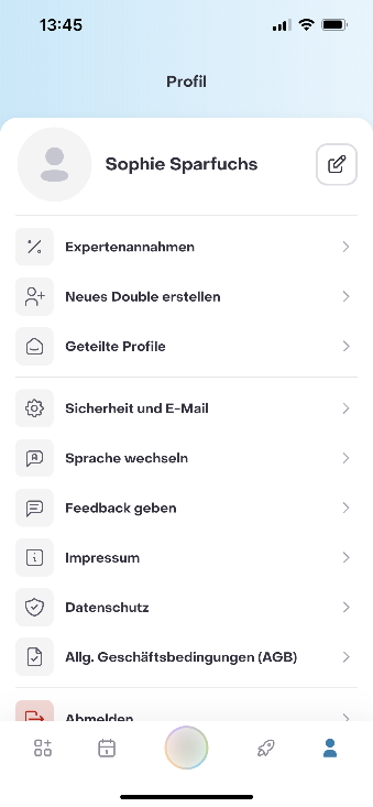 Unter Profil kannst Du Expertenannahmen ändern, eine neue Profilvorlage erstellen und Dein aktuelles Profil mit einem anderen Nutzer teilen. Zusätzlich kannst Du hier Deine E-Mail bzw. Passwort ändern, die Sprache wechseln oder dich abmelden. Gib uns gerne außerdem Dein Feedback, falls in der App etwas nicht wie erwartet funktioniert, Du einen Verbesserungsvorschlag hast, oder Du eine Frage hast. Dies hilft uns dabei laufend unsere App weiter zu verbessern. Wenn Du Dein Handy schüttelst, kommst Du jederzeit zum Feedback Interface, sodass unser Entwicklerteam noch besser nachvollziehen kann an welcher Stelle Du Probleme hattest. Hier findest Du auch unser Impressum, unsere Datenschutz-erklärung und die allgemeinen Geschäftsbedingungen.