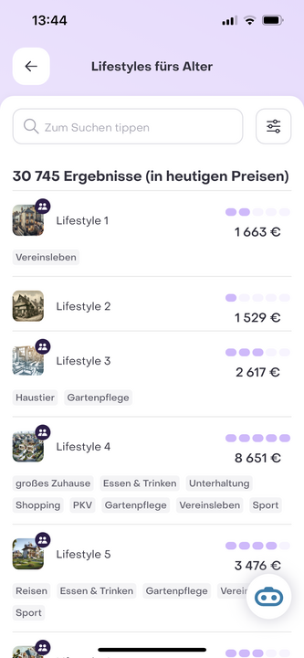 Falls Dein geplanter Lifestyle im Alter sich von Deinem heutigen unterscheidet, oder Du die Auswirkungen einer Lifestyle-Anpassung analysieren möchtest, kannst Du hier einen angestrebten Lifestyle fürs Alter anschauen und auswählen. Dabei hilft Dir die Filterfunktion (oben rechts), den für Dich passenden Lifestyle anhand Deiner Lebenssituation, Ausgabenmix und Anderer Lifestyle-Attribute auszuwählen. Du kannst unter Dashboard Zukunft >> Ausgaben >> Bearbeiten zwischen dem aus heutigen Daten hochgerechneten Lifestyle oder dem gewählten Lifestyle im Alter wählen, um verschieden Lifestyle-Entscheidungen zu simulieren.